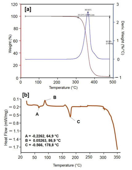 Thermo-gravimetric analysis was performed on a Q500 equipment (TA Instruments, New Castle, DE, SUA), in air atmosphere, at temperatures between 20–350 °C and a heating rate of 10 °C/min. The differential scanning calorimetric analysis was performed on a Netzch Proetus equipment (TA Instruments, New Castle, DE, SUA), in air atmosphere, at temperatures between 20–350 °C and a heating rate of 10 °C/min.