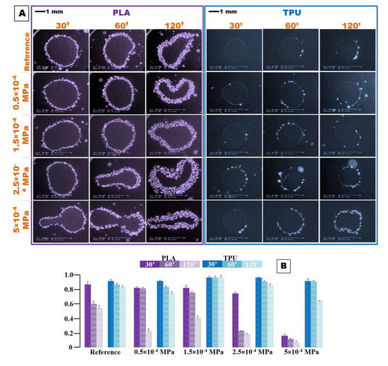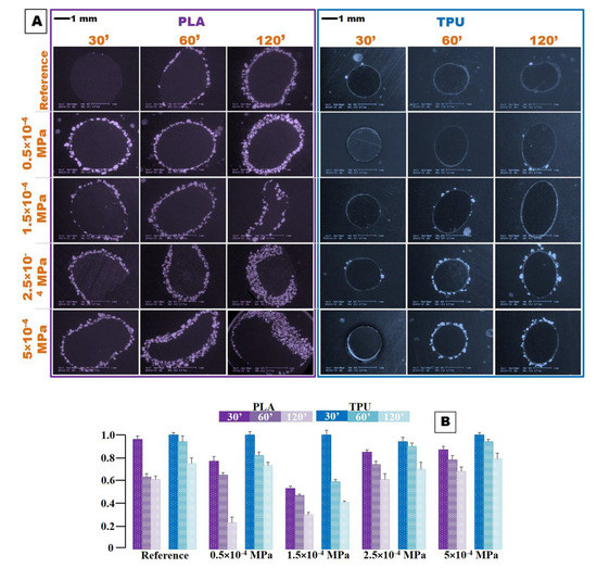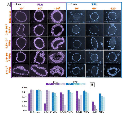 In addition, in the case of both PLA and TPU samples, one can note that a uniform or even addition of HA particles causes the cylindricity retention of the polymer filament (see Figure 5A PLA – 30’, 60’ – 0.5 × 10−4 MPa and TPU – 60’ – 2.5 × 10−4 MPa and 60’ – 5 × 10−4 MPa).