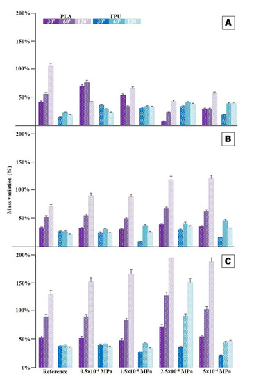 Moreover, in the case of TPU filaments, significant changes in mass variation were depicted. At this high temperature, the particles adhere easily to the polymer surface, and therefore their mass increases up to 160% at an exposure time of 120’.