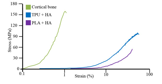 Compression curves of cortical bone, TPU-based materials obtained at 215 °C, 60’ of exposure, and 2.5 × 10−4 MPa pressing force with HA particles embedded and PL- based materials obtained at 205 °C, an exposure time of 60’, and a maximum pressing force of 0.5 × 10−4 MPa.