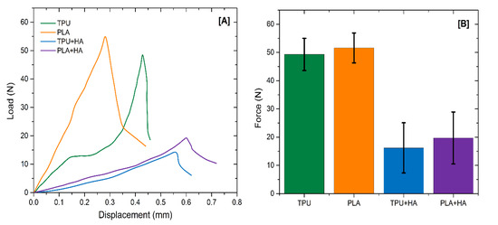 (A) Displacement force curves of TPU, PLA, the TPU-based materials obtained at 215 °C, 60’ of exposure, and 2.5 × 10−4 MPa pressing force with HA particles embedded, and PLA-based materials obtained at 205 °C, an exposure time of 60’, and a maximum pressing force of 0.5 × 10−4 MPa. (B) The maximum displacement forces for the same samples.