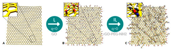 Models of the three different graphenic species involved in obtaining the topologies used in the simulations: (A) Pristine graphene; (B) graphene Oxide (GO) obtained from pristine graphene, with a negative net charge; (C) aminated graphene NH2-PEG (rGO-PEG-NH2) obtained from GO, with a positive net charge.