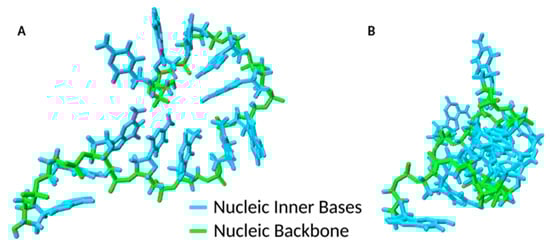 For both the double-stranded and single-stranded DNA molecules we used the Dickerson–Drew dodecamer [] with the following sequence, 5‘-CGCGAATTCGCG-3’, which has been extensively used in similar MD studies [,,,]. The choice was motivated from an aim to advance the results of previous studies [,,] with direct comparison to their findings. The double-stranded B-DNA structure was generated using the Nucleic Acid Builder (NAB), part of the AmberTools18 package [], and converted into GROMACS [] topology using the tools Leap and Parmed, components of AmberTools18. Visual representations of the two DNA molecules are presented in Figure 1.