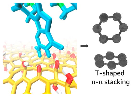 As the oligonucleotide chain remained close to the GO, the CSA value increased up to 2 nm2 at t ≈ 2.50 ns, corresponding to the formation of three hydrogen bonds and a T-shaped π–π stacking in which the rings adopt a perpendicular geometry [], as shown in Figure 4. This type of π-stacking has been previously observed in DNA–protein interactions []. Despite respecting our π–π stacking criteria, the GO region involved was heavily oxidised, and this oxidation could shield and significantly weaken the π-stacking energy. The T-shaped stacking broke apart at t = 82ns.
