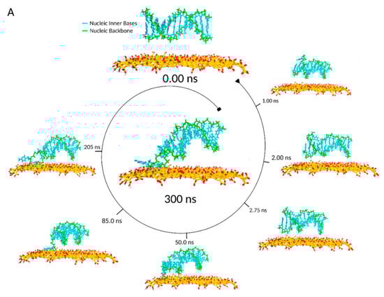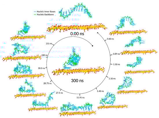 The shape of the ssDNA molecule after t = 2 ns remained largely similar until the end of the simulation at t = 300 ns (Figure 9). At t = 22 ns, the angle between the oligonuncleotide backbone and the rGO surface increased to 15–20°, but decreased to 5–10° at t = 100 ns, remaining so until the end of the simulation (Figure 10F).