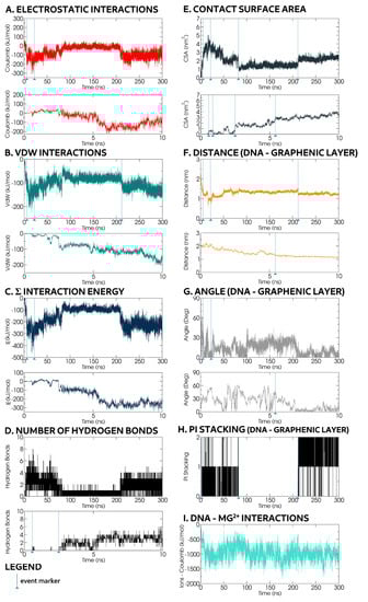 Evolution of different parameters over the 300 ns simulation time: (A) Electrostatic interactions between GO and ssDNA; (B) VdW interactions between GO and ssDNA; (C) Interaction energy between GO and ssDNA; (D) Hydrogen bonds formed between GO and ssDNA; (E) Contact surface area between GO and ssDNA; (F) Distance between the ssDNA molecule and the graphene layer; (G) Angle between the ssDNA molecule and the graphenic layer; (H) π–π stacking between ssDNA and the graphenic layer; (I) Electrostatic interactions between the ssDNA molecules and Mg2+ ions within 1.4 nm of both the ssDNA and the GO.