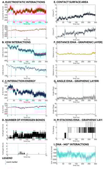 Evolution of different parameters over the 300ns simulation time: (A) Electrostatic interactions between GO and dsDNA; (B) VdW interactions between GO and dsDNA; (C) Interaction energy between GO and dsDNA; (D) Hydrogen bonds formed between GO and dsDNA; (E) Contact surface area between GO and dsDNA; (F) Distance between the dsDNA molecule and the graphene layer; (G) Angle between the dsDNA molecule and the graphenic layer; (H) π–π stacking between dsDNA and the graphenic layer; (I) Electrostatic interactions between the dsDNA molecules and Mg2+ ions within 1.4 nm of both the dsDNA and the GO.