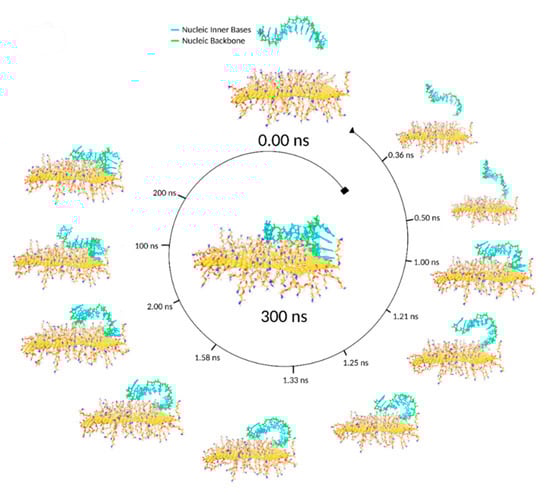 Trajectory snapshots ranging from 0 to 300 ns of ssDNA and rGO-PEG-NH2 in the presence of both Mg2+ and Cl− atoms (ions not shown).