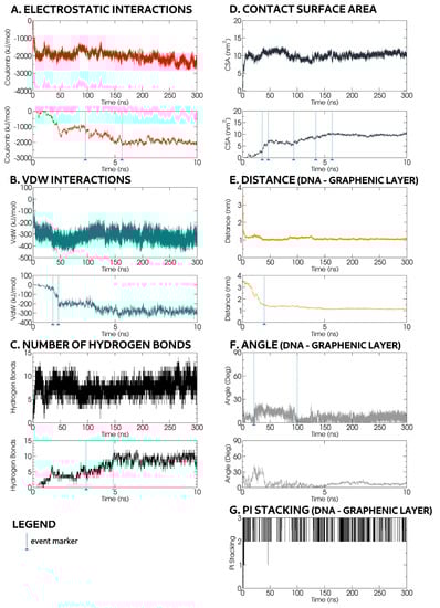 Evolution of different parameters over the 300 ns simulation time: (A) Electrostatic interactions between rGO and ssDNA; (B) VdW interactions between rGO and ssDNA; (C) Hydrogen bonds formed between rGO and ssDNA; (D) Contact surface area between rGO and ssDNA; (E) Distance between the ssDNA molecule and the graphenic layer; (F) Angle between the ssDNA molecule and the graphenic layer; (G) π–π stacking between ssDNA and the graphenic layer.