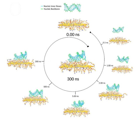 Trajectory snapshots ranging from 0 to 300 ns of dsDNA and rGO-PEG-NH2 in the presence of both Mg2+ and Cl− atoms (ions not shown).