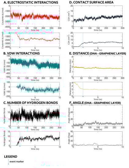 Evolution of different parameters over the 300 ns simulation time: (A) Electrostatic interactions between rGO and dsDNA; (B) VdW interactions between rGO and dsDNA; (C) Hydrogen bonds formed between rGO and dsDNA; (D) Contact surface area between rGO and dsDNA; (E) Distance between the dsDNA molecule and the graphenic layer; (F) Angle between the dsDNA molecule and the graphenic layer.