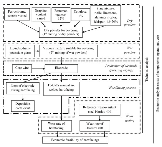 Electrodes for the fabrication of Fe–C–Cr hardfacings were manufactured by a company (industrial-scale producer of electrodes). Figure 1 explains the main components and steps required to produce and estimate the economic feasibility of hardfacings. The contents of graphite and ferrochrome (HC Fe–Cr) in the coverings were varied to obtain hardfacings with suitable carbon and chromium contents, as shown in Table 1. The codes of the electrodes (and samples obtained with their help) are indicated. The content of high-carbon ferrochrome in the electrode covering ranged from 5.3 to 85%, while the content of graphite ranged from 0.1 to 30.0%. The covering was reinforced with cellulose. The limits of the studied ranges of ferrochrome and graphite were influenced by the technological feasibility of the electrode production process.
