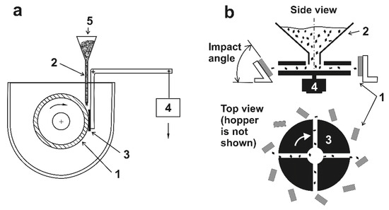 Schematic of the devices used for testing samples under abrasive conditions: (a) according to ASTM G65 (1—rubber-rimmed steel wheel; 2—abrasive supply nozzle; 3—sample; 4—load; 5—quartz sand); (b) according to GOST 23.201-78 (1—samples; 2—erodent hopper; 3—rotor with channels; 4—electrical motor [25].