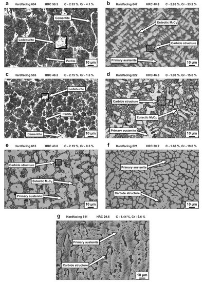 Variation of graphite (0.1–30.0%) and ferrochrome (5.3–85.0%) contents in the covering of electrodes resulted in the formation of a wide range of Fe–Cr–C microstructures, such as primary austenite, ledeburite, perlite, cementite, and eutectic M7C3. The prevailing austenite structure of Sample 611 resulted in the lowest hardness (Figure 5). The microstructure of hardfacings will be discussed in more detail in the following sections.