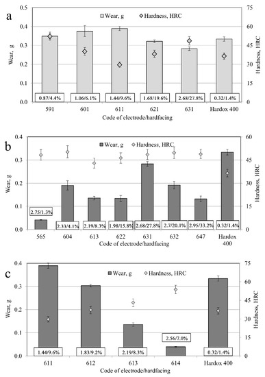 In the case of Group 591/631 with varied carbon and chrome contents, it was found that the hardness (29.6–52.2 HRC) and wear resistance were directly correlated. Materials with high hardness (591, 631) exhibited low wear rates, whereas Material 611 with the lowest hardness had the highest wear rate. The wear rate of hardfacings was similar to that of Hardox 400 (the difference ranged from −18 to +14%).