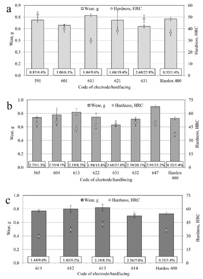 Technical (mass of electrodes, deposition coefficient of electrode, wear rates, and wear intensity ratio of materials) and economic (electrode, hardfacing material cost, deposited hardfacing cost, hardfacing productivity, etc.) indicators are presented in Table 5.