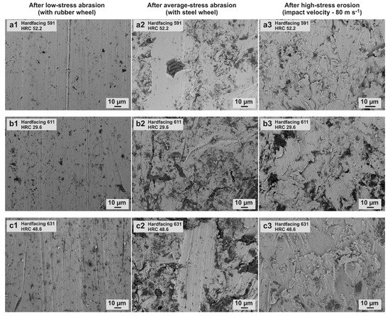 Comparing the results of all the samples tested under average-stress conditions with those of the reference steel Hardox 400, it could be concluded that the hardness in addition to the microstructure and quality of materials (presence of defects such as cracks or porosity) influenced the wear resistance [27]. The wear rates of the tested hardfacings differed by −15% to +20% in comparison to Hardox 400, which indicated that such hardfacings could not generally provide significant advantages under average-stress three-body conditions.