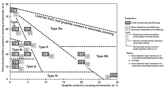 Both the graphite and chromium (usually ferrochromium) contents in an electrode covering have a significant influence on the formation of (Fe,Cr)7C3 carbides in hardfacings, as well as on the cost of the electrodes. Therefore, the current study provides an analysis of electrodes, manual arc-welded hypoeutectic hardfacings with varied carbon and chromium contents, as well as their technical (hardness and wear rate in erosive and abrasive conditions) and economic assessment. Conventional wear-resistant Hardox 400 steel was evaluated as a reference material for the economic feasibility calculations of the produced Fe–C–Cr hardfacings. The wear and economic feasibility map resulting from the current study can serve as a tool for the selection of optimal hardfacings for applications in which the wear resistance of materials plays an important role.