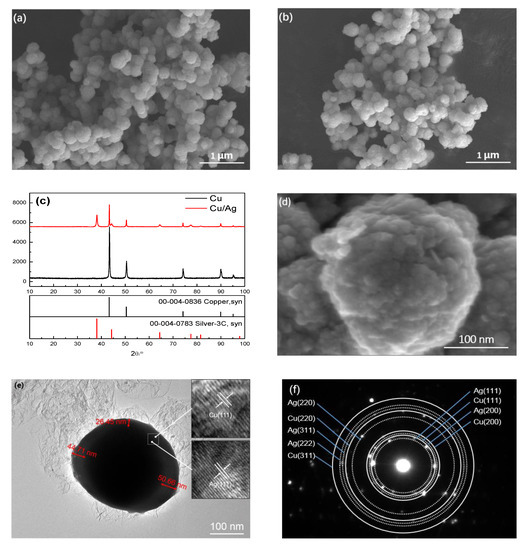 The Cu/Ag core-shell composite replicate the spherical structure of the Cu particles (Figure 1a,b), while the particle size distribution of specimens show that the two materials have similar average particle sizes (227.17 nm for Cu, 234.96 nm for Cu/Ag core-shell composite), but the size of Cu/Ag core-shell composite is slightly larger than the Cu particles (Figure 1i). Considering the agglomeration properties of the nanoparticles, for each sample, a large number of SEM images were measured, then 2000 particles were randomly selected for measurement and statistics, and the particle size distribution map was finally drafted. This phenomenon proves once again that Equation (3) is effectively inhibited, and the reduction reaction of Ag+ ions mainly occurs in the solution. X-ray diffraction (XRD) measurements were made on the specimens to assess the structure and phase purity. The diffraction peaks can be indexed to a Copper, syn structure of Cu, Copper, syn, and Silver-3C, syn structure of Cu/Ag core-shell composite, as shown in Figure 1c. No diffraction peaks from impurities were found in the specimens. These results provide parameters for the simulations below. However, the peaks of the Cu/Ag core-shell composite are significantly broadened, demonstrating that the crystallinity of the material deteriorated. To ascertain the core-shell structure, the TEM and SEM-EDS cross-sectional images are presented in Figure 1g. In Figure 1e,f, the TEM image of the specimen confirms that it is indeed a core-shell structure, and the average thickness of the shell layer is about 40 nm. The SAED and EDS patterns further confirm the core-shell structure and the components. In Figure 1g, there is a strong intensity of copper on the core and a weak intensity of silver on the shell, and the composites contain 21.86 wt.% of Ag, 78.14 wt.% of Cu. (The background value of the epoxy resin has been removed). The above characterization results are similar to those in the literature, proving that the material synthesis is successful [13].