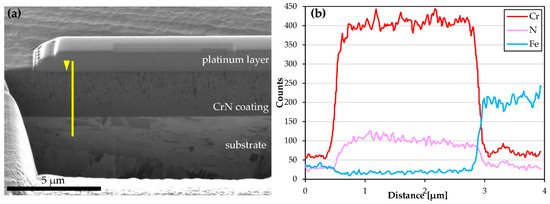 CrN coating in initial state, (a) ion induced secondary electron image of CrN coating cross-section, (b) chemical composition obtained by EDS analysis along the line depicted in the image (a).