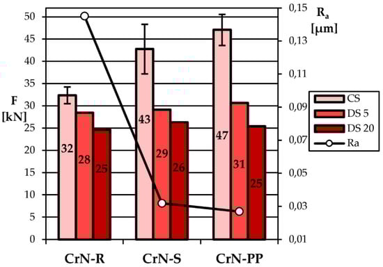 Maximal ejection force obtained for CrN pins with the different roughness in different experimental setups, error bars represent the ±1, 95% confidence interval (CI).