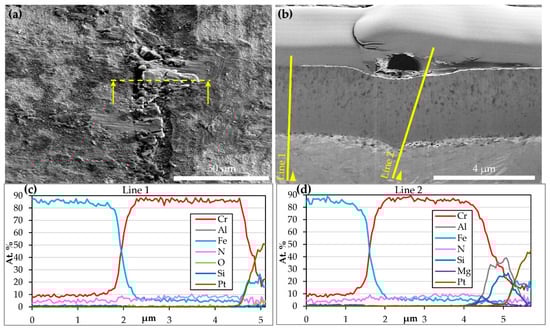 Focused ion beam (FIB) analysis of the CrN-R pin sample with aluminum built-up after casting solidification (CS) experiment, (a) secondary electron image, line and arrows indicate FIB milling line and the direction of cross section observation, (b) cross-sectional ion induced secondary electron image, (c) and (d) chemical composition obtained by EDS analysis conducted on cross section along lines drawn in the image (b).