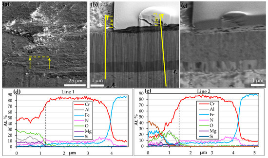 FIB analysis of the CrN-R pin sample with aluminum built-up after DS 20 experiment, (a) secondary electron image, line and arrows indicate FIB milling line and the direction of cross section observation, (b) cross-sectional secondary electron image, (c) cross-sectional ion induced secondary electron image, (d) and (e) chemical composition obtained by EDS analysis conducted on cross section along lines drawn in the image (b).
