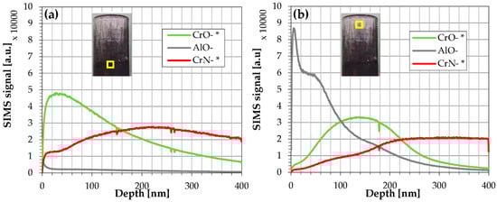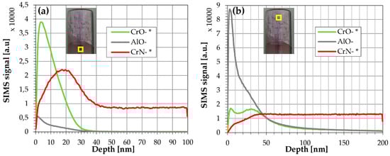 A very thin surface layer of Cr–O (15–20 nm) is found at both analyzed location of CrN-R sample from CS experiment. This layer formed on the top of CrN coating, Figure 6. A peak of CrN− near the surface region is not realistic, it is an artefact of the applied measuring technique. It formed due to the matrix effect caused by presence of an oxide [25]. At the location which was not exposed to a cast alloy a smaller quantity of Al–O was found in a thin surface layer, Figure 6a. On the other side, at the location which was exposed to a cast alloy a 15 nm thick layer with higher quantity of Al–O was detected, Figure 6b. It has to be noted that the thin layer with high Al–O content also has lower content of Cr–O.