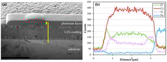 CrN coating in annealed state, (a) ion induced secondary electron image of CrN coating cross-section in the annealed state, (b) chemical composition obtained by EDS analysis along the line depicted in the image (a).