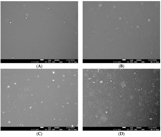 Figure 1A–D show the FE-SEM images for unmodified and SNP-modified coatings; all of the images were taken at the same magnification. Figure 1A shows a smooth and plain surface of the epoxy material without the presence of any particles. With the addition of nanoparticles in the epoxy, starting from 1%, followed by 3%, and 5%, changes can be seen from Figure 1B–D. The images show that the nanoparticles are well dispersed and distributed throughout the matrix, with quite a few aggregate formations. The formation of aggregates with the use of nanoparticles is common, happening because of the high attraction forces between nanoparticles due to their high surface area. Another reason is the mixing of particles in a high viscous matrix [25]. EDX was simultaneously performed with SEM; Table 2 shows the overall composition of elements obtained in the EDX.