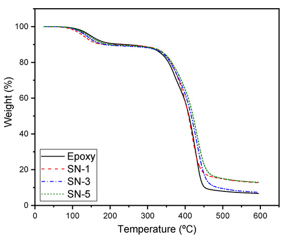 Figure 2 shows the thermal behavior of the epoxy and SNP-modified epoxy coatings and Table 3 summarizes their degradation temperatures (Td). All of the curves depicted a similar weight loss pattern. A two-step degradation can be observed from the graphs. First, a step involves weight loss starting at approximately 100 °C, proceeding until approximately 300 °C, which involves the removal of solvent traces and other volatile substances, the degradation of residual reactants, or the decomposition of the resin’s low molecular weight fractions [26,27,28]. Approximately 15% of the weight loss occurred in all of the formulations at this first stage of degradation.