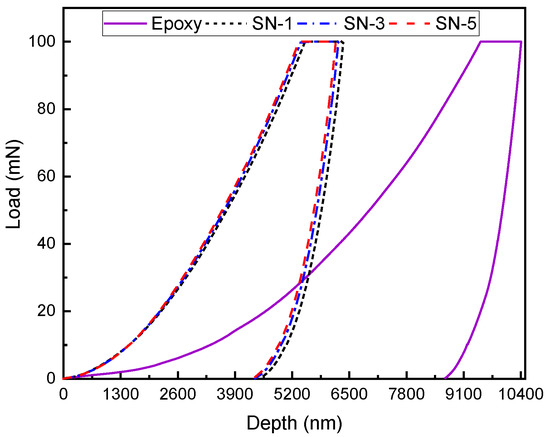 Nanoindentation was performed on all of the coating formulations, attaining a maximum load of 100 mN, and typical load vs. displacement curves for all of the coating samples are shown in Figure 3. From the curves, it can be seen that no discontinuities are present (i.e. no significant jump in depth values), which suggests that no cracking occurred during the indenting phase. All of the formulations were subjected to similar loading conditions. From Figure 3, it can be seen that the incorporation of nanoparticles shifted the depth of all curves to lower values, which suggests that the incorporation increased the resistance of the coating against the indentation force; this, in turn, represents an increase in the load-bearing capacity of all the coatings. At the maximum load, the depth values for the epoxy formulation was 10,405 nm, with the addition of 1%, 3%, and 5% the maximum depth values were significantly reduced and restricted to 6360, 6249, and 6184 nm, respectively. This reduction of depth values suggests an increase in the hardness properties.
