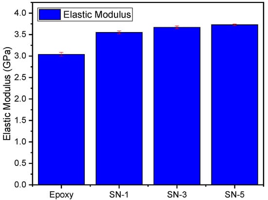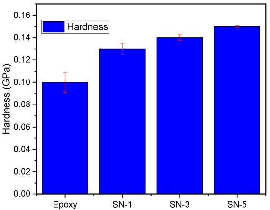 The high modulus values of the modified coatings were due to the addition of the SNPs [40,41,42], which in turn, increased the modulus of the coatings [43]. The increase in hardness was mainly due to the free volume reduction in the cross-linked epoxy matrix. This reduction in the free volume happens due to the addition of nanoparticles [44,45].
