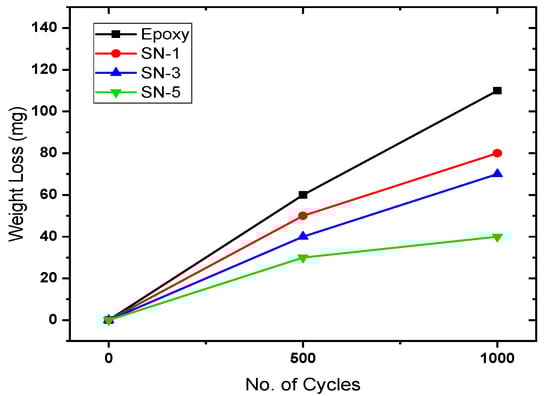 Figure 6 shows that the highest recorded weight loss was for the unmodified epoxy coating: 60 mg at 500 cycles and 110 mg at 1000 cycles. The addition of nanoparticles from 1% to 5% decreased the abrasion of the coatings, and the lowest abrasion was recorded with the 5% nanoparticles formulation. At 1000 cycles, a significant increase in the abrasion resistance was witnessed in comparison with the unmodified epoxy coating.