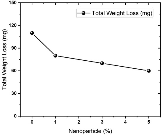 The results indicated an increase in the abrasion resistance with the addition of nanoparticles [7,46]. Figure 7 shows that the weight loss started to decrease with the addition of nanoparticles. The total weight loss calculated was 60 mg with the addition of 5% SNPs, which was a 45% increase in the abrasion resistance when compared to the 110 mg weight loss of the epoxy without nanoparticles.