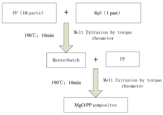 In this experiment, double melt blending was used for the composites’ preparation. During the preparation process, the nano-MgO and PP particles were placed into torque rheometer for melt blending directly. The process of composite preparation by double melt blending is shown in Figure 1 [25].