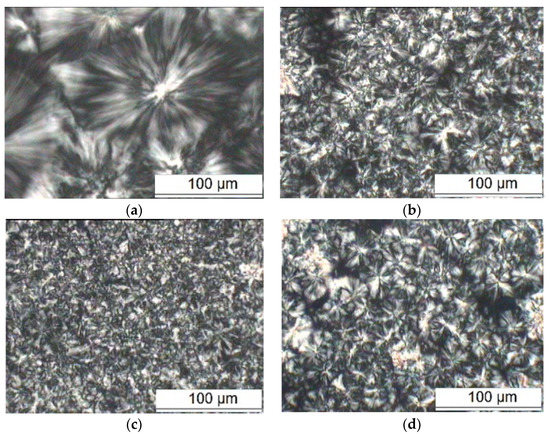 PLM patterns of nano-PP/MgO composites: (a) PP; (b) 1% nano-MgO/PP; (c) 3% nano-MgO/PP; (d) 5% nano-MgO/PP.