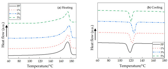 Combining the experimental results of Figure 3 and Table 1, the crystallization peak temperatures Tc of different MgO/PP composites were all higher than those of pure PP at the same cooling rates. This illustrated that the samples crystallized at high temperature with nano-MgO particle doping. During DSC orientation, the lower the temperature of the samples’ crystallization peaks, the lower the crystallization rates of polymer. The temperature, in which crystal formation rate was highest, was selected as Tc. When the mass fraction of nano-MgO particles was 3%, the Tc of MgO/PP composite was the highest, 125.3. At this time, the samples’ crystallinity was also the highest, 49.2. The crystallization rate order of the four samples was as follows: PP < 5% < 1% < 3%. From the test results, MgO particle doping improved the crystal formation rate of PP, and the width of the exothermic crystallization peak ΔTc of nanocomposites was less than that of pure PP. This illustrates that the effects of different MgO particle sizes on crystal formation rate of PP were different. The crystallinity values of nano-MgO-composites with 1%, 3% and 5% particle mass fractions were 2.1%, 4.9% and 2.9% higher than that of pure PP, respectively.