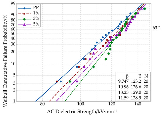 The AC breakdown test results of different nano-MgO/PP composites are shown in Figure 4. In this experiment, the breakdown test result was characterized by a Weibull distribution. Compared with common data plotting, the Weibull distribution can evaluate the insulating material breakdown action under an AC electric field effectively. This reflects the probability of samples being broken down under a certain electric field strength; in other words, it reflects the material failing probability at a certain time.