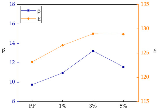 The shape parameter and breakdown field strengths of different samples for Weibull distribution are shown in Figure 5. The scale parameter E reflects the samples breakdown field strength, and the shape parameter β reflects the dispersion of breakdown voltage. In the matrix materials, a larger β indicates a better dispersion.