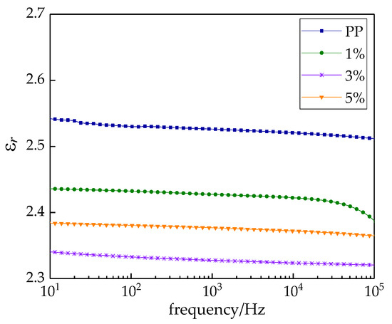 The relations between the relative dielectric constant εr and the frequency of different samples are shown in Figure 6. The relative dielectric constant showed a downward trend with increasing frequency. The change rules of nanocomposites and pure PP were identical. This illustrated that the polarization establishment processes of nanocomposites and pure PP were also identical. They all accorded with the general law of dielectric relative dielectric constant. In low applied frequency, the dielectric constant was basically unchanged. As the frequency increased, the dielectric constant decreased gradually. This was because nanoparticle doping formed an interface structure in the polymer matrix, which inhibited the movement of PP macromolecule chains. The polarization establishment process suffered serious obstacles, so the dielectric constant was lower [32]. In the low-frequency region ωτ ≤ 1, εr → εs was established promptly in both instantaneous polarization and relaxation polarization. When ωτ approached 1, the macromolecule chains of PP could not keep up with the gradually increasing change of applied electric field, so the relaxation polarization could not be established. The relaxation polarization made less of a contribution to the dielectric constant of composite, which reduced the εr of MgO/PP composites. As the applied electric field continued to increase, the dipolar polarization of MgO/PP composites could not keep up with the changing of the applied electric field. At this time, the displacement polarization played the major role in the polarization process. Hence, the dielectric constant of composites showed a downward trend until it dropped down to a relatively stable value. From the test results, with the frequency increasing, the downward trend of composites’ dielectric constants was obvious and finally stabilized. The dielectric constant of pure PP was 2.5 and higher than that of all the composites. Among the composites, when the mass fraction of nano-MgO particles was 1%, the dielectric constant was the highest, 2.43. This was because nano-MgO particle doping produced physical crosslinking points in the movement of PP macromolecule chains, which exerted the small size effect and surface effect on nanoparticles. Additionally, more interface active regions were introduced by the inorganic particle doping. A closer interface structure was formed between nanoparticles and polymer through the covalent bond. In summary, nano-MgO-particle doping could limit the movement of polymer macromolecule chains effectively, and the dielectric constants εr of nanocomposites were lower than that of pure PP.