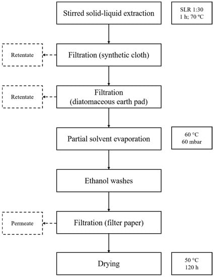 Flowchart of the extraction process used for obtaining aqueous P. dioica extracts. Dashed lines represent the rejected fractions of filtration.