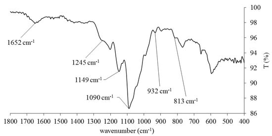 The dried extract was analyzed using a Fourier transform infrared (FTIR) spectroscopy with attenuated total reflectance (ATR), confirming the presence of porphyran, as per displayed in Figure 2. (See Figure S1 in the Supporting Material for the full spectrum). FTIR analyses were carried out using an Alpha-P Brucker FTIR-ATR spectrometer, in the range of 4000–400 cm−1, at a 4 cm−1 resolution with 64 scans. It was possible to observe the absorption bands typically assigned to the sulphate ester moieties at ca. 1245 and 813 cm−1. The strong bands within the 1200–1000 cm−1 range were tentatively assigned to secondary alcohol C-O stretching vibrations and galactose residue ring vibrations, as reported for closely related galactans such as carrageenan and agarose [41,42]. The existence of a weak band at ca. 932 cm−1 was attributed to the presence of 3,6-anhydrogalactose residues in the polysaccharide chain. Additional bands could be observed at ca. 3360 and 1652 cm−1, which were respectively assigned to hydroxyl and carbonyl stretching vibrations. The C-H stretching vibrations were also observed as weak bands in the 3000–2800 cm−1 range [21,39,40].