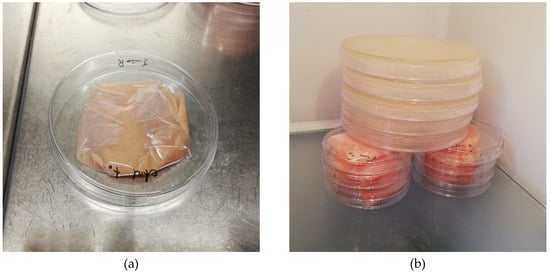 The boneless, skin-on chicken breasts used for testing the shelf-life enhancing effect of the coated films were received in refrigerated plastic trays and processed within 12 h of slaughter. The trays were opened, and the chicken breasts were ground into round paddies (55 mm wide, 15 mm thick) using a sanitized food processor inside a laminar flow chamber. These paddies were then manually wrapped in the coated PP film sheets and stored inside 90 mm petri dishes for convenience. “No film” (NF) control samples were stored inside the petri dishes without wrapping of any kind, while “uncoated film” (UF) control samples were wrapped in uncoated PP film. The samples were stored for a maximum period of four days under 4 °C, and while in storage, the petri dishes were lightly pressed, as to guarantee the paddies inside were making full contact with the coated wrapping. Figure 3a shows the wrapped chicken paddy inside its storage petri dish. Figure 3b demonstrates how these samples were stored in refrigeration.