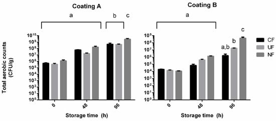 Total mesophile aerobic organisms counts during storage of poultry samples wrapped in coated PP films (CF), uncoated PP films (UF), and no film (NF). Coating A = 5 wt% P. dioica extract and 7.5 wt% PVA. Coating B = 1 wt% P. dioica extract, 1 wt% PVA, and 17 wt% gelatine. Results are presented as averages (n = 4) and standard deviation. a, b, and c represent statistically identical counts with p < 0.001, determined by Tukey’s HSD.