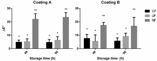 Colour difference between poultry samples treated with (CF) coated PP film, (UF) uncoated PP film, (NF) no film. Coating A = 5 wt% P. dioica extract and 7.5 wt% PVA. Coating B = 1 wt% P. dioica extract, 1 wt% PVA, and 17 wt% gelatine. Results presented as the average of three readings of three samples (n = 3). * and ** Identify statistically identical results, with p < 0,01, determined by Tukey’s HSD.