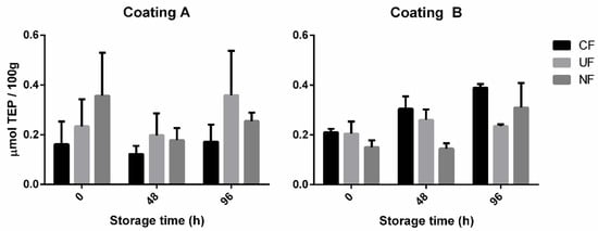 Concentration of thiobarbituric acid reactive substances present in the poultry samples treated with (CF) coated PP film, (UF) uncoated PP film, (NF) no film. Coating A = 5 wt% P. dioica extract and 7.5 wt% PVA. Coating B = 1 wt% P. dioica extract, 1 wt% PVA, and 17 wt% gelatine. Results presented as the average of three samples (n = 3). No statistical differences were detected in the pool of tested samples.