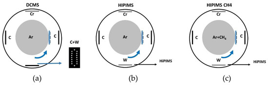 Schematic illustration of the deposition chamber and distribution of targets used for the films deposited for this work, (a) DCMS, (b) HIPIMS and (c) HIPIMS CH4.