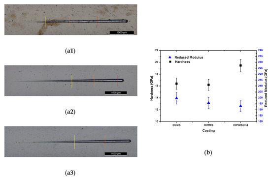 Adhesion scratches and critical loads of: (a1) DCMS, (a2) HIPMPS, (a3) HIPIMS CH4; Hardness and reduced Young´s modulus of the films (b).