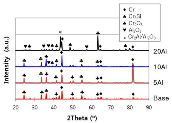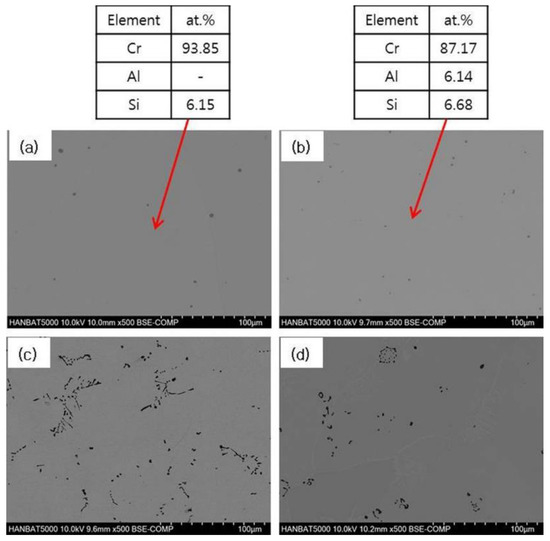 The demand for alloys that surpass the high-temperature properties of Ni-based superalloys is steadily increasing as the operation temperature of high-temperature components increases. It is a refractory-based alloy having a melting point higher than 1900 °C that is promising as an alternative metallic material [1]. Especially since Cr and Cr–Al alloys are excellent in high temperature oxidation resistance, they are suitable as materials for high-temperature components or oxidation-resistant coating, and related research has been conducted [2,3,4,5,6,7,8]. For instance, some research has been carried out to apply Cr or Cr–Al powders to the surface coating of the nuclear fuel cladding by using a laser surface-melting method [8,9]. Recently, a study was conducted that focused on Cr–Al alloys containing Si for the purpose of enhancing the high-temperature hardness and strength of the Cr–Al alloys [10]. Thermal stability of Cr3Si phase and the possibility of improvement of high-temperature strength due to formation of it have already been reported; however, only a few research studies have been done on the formation of Cr3Si phase in Cr–Al–Si alloys [11,12]. In addition, although the oxidation resistance due to the formation of Cr and Al oxides in Cr–Al–Si alloys has been studied to some extent [13,14], the microstructure changes due to the addition of Si are still insufficient. For example, it has been reported that, when a certain amount of silicon is added, a Cr3Si phase is formed, but the critical Si content is related to the amount of Al added, which requires further investigation [10,15].